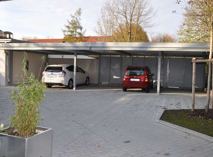Die Dachbegrünung auf allen Flachdächern des Rückgebäudes und der Carports sowie der angrenzende Stadtpark sorgen für ein grünes Ambiente.