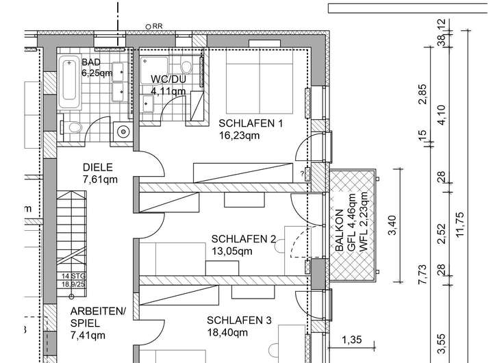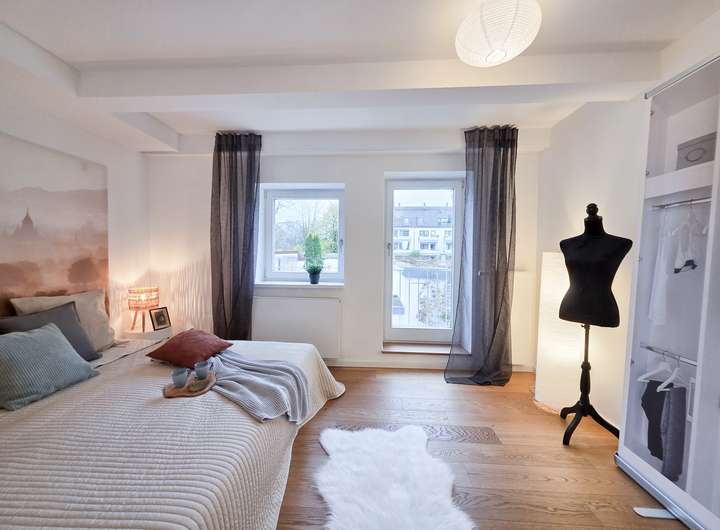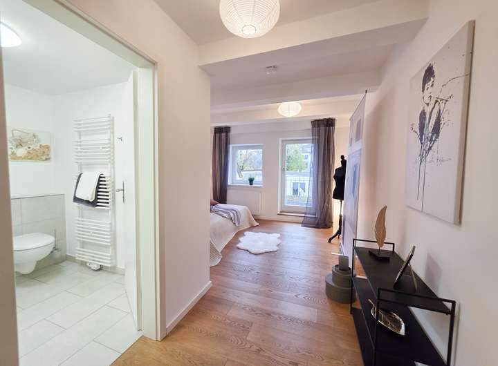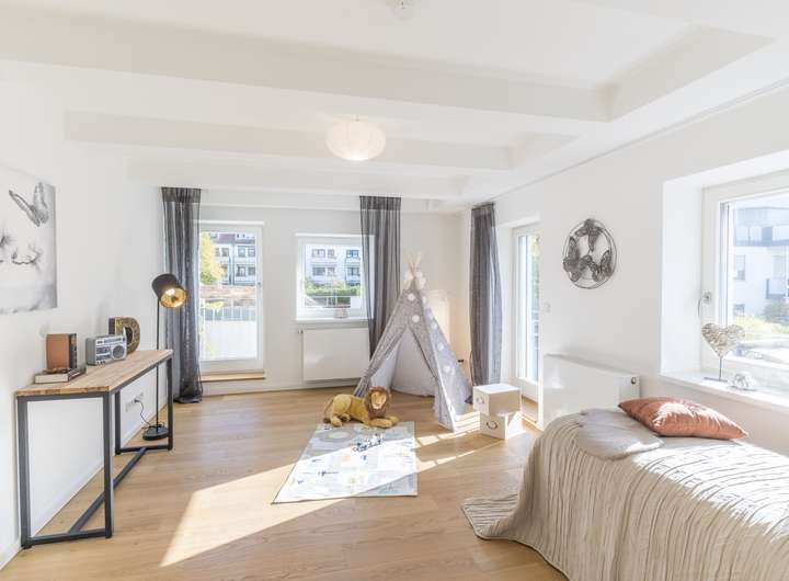Eines der Schlafzimmer verfügt über einen eigenen Balkon in Richtung Osten. In der Diele befindet sich außerdem ein Arbeits-/Spielbereich mit 7,4qm.