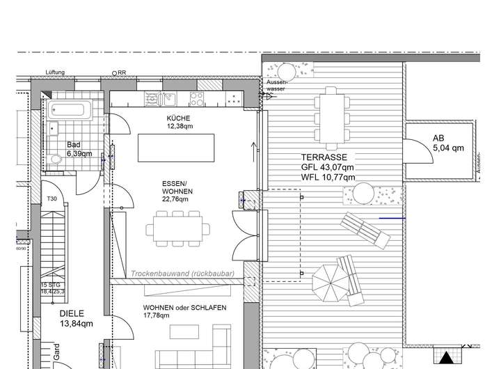 Zudem können Ess- und Wohnzimmer, die aktuell durch eineTrockenbauwand getrennt sind, entweder durch eine Tür miteinander verbunden werden oder die Trockenbauwand kann ohne Rückstände komplett rückgebaut werden, sodass ein großzügiger Wohn- / Essbereich entsteht (siehe Grundriss Variante 1).