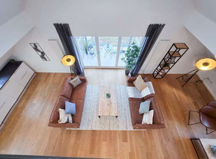 Das großzügige DG-Studio ist zum Treppenhaus hin durch eine Glaswand abgeschlossen und lässt vielfältige Nutzungsmöglichkeiten zu: Vom großzügigen Wohnzimmer, seperatem Büro, Eltern- oder Au-Pair Bereich bis hin zum Hobby- oder Fernsehraum.