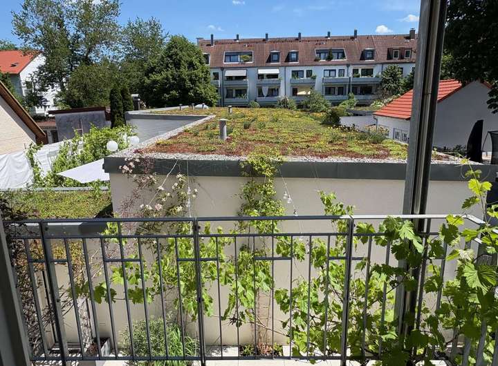 Vom Balkon aus genießt man hier einen weitläufigen Blick auf die begrünten Flachdächer der Anlage.