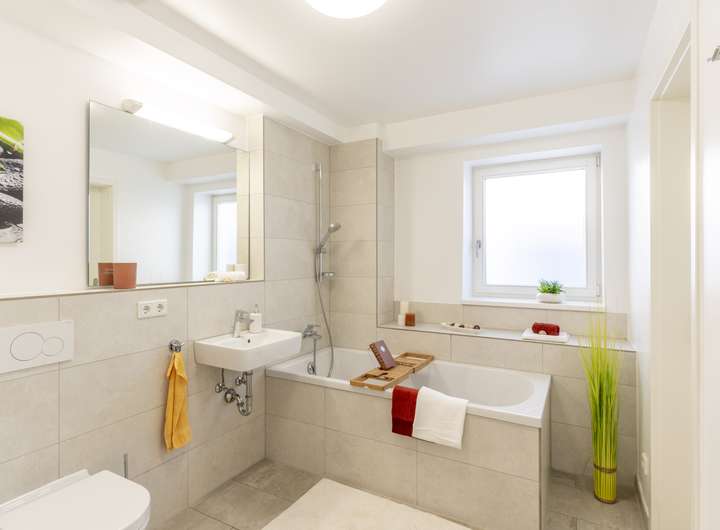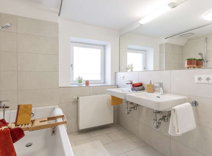 * Alle Bäder sind mit italienischen Feinsteinzeugfliesen, hochwertigen Accessoires inkl. großem Spiegel und Beleuchtung ausgestattet