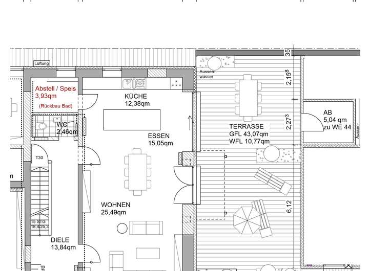 An die Terrasse angrenzend befindet sich ein 5 qm großer Abstellraum, der z.B. für Gartenmöbel genutzt werden kann.