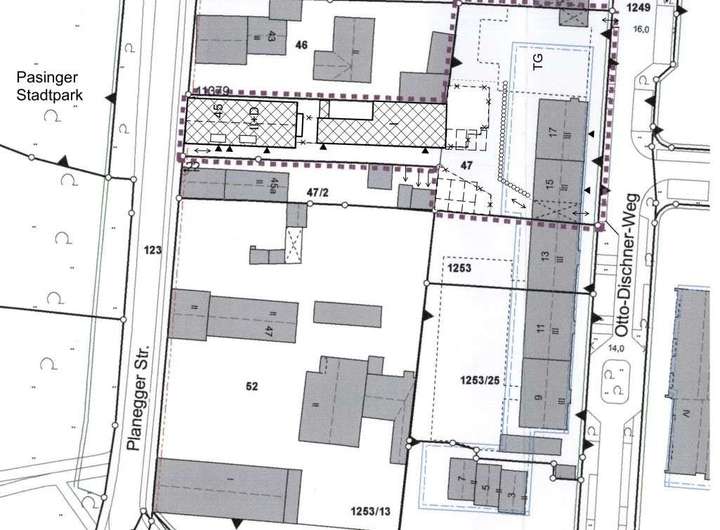 Das Objekt liegt auf einem langgezogenen Grundstück zwischen der Planeggerstraße und dem Otto-Dischner-Weg.