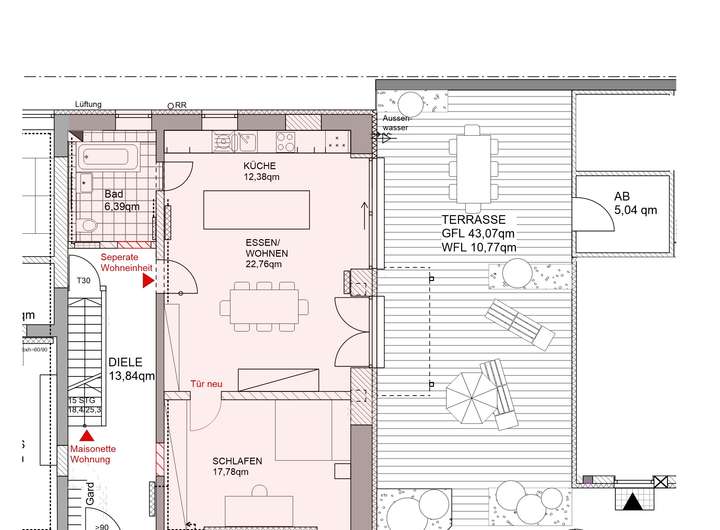 Im Dachgeschoss ist außerdem ein weiterer Küchenanschluss vorgesehen, der eine zweite Küchennutzung ermöglicht (siehe Fotos).