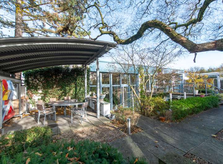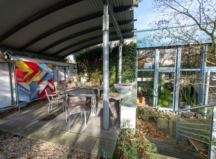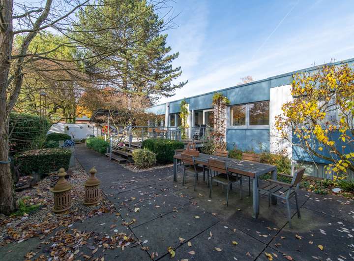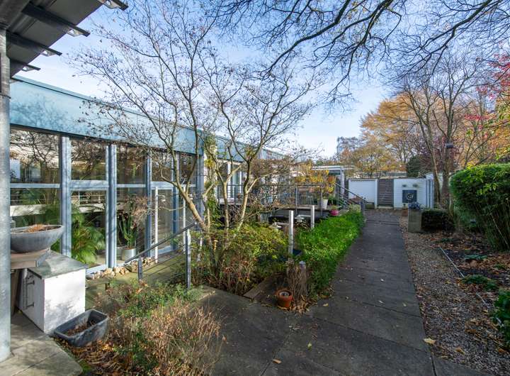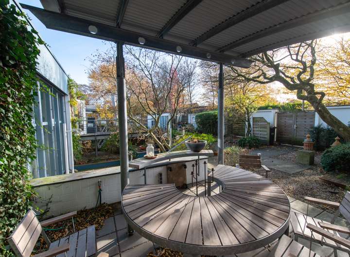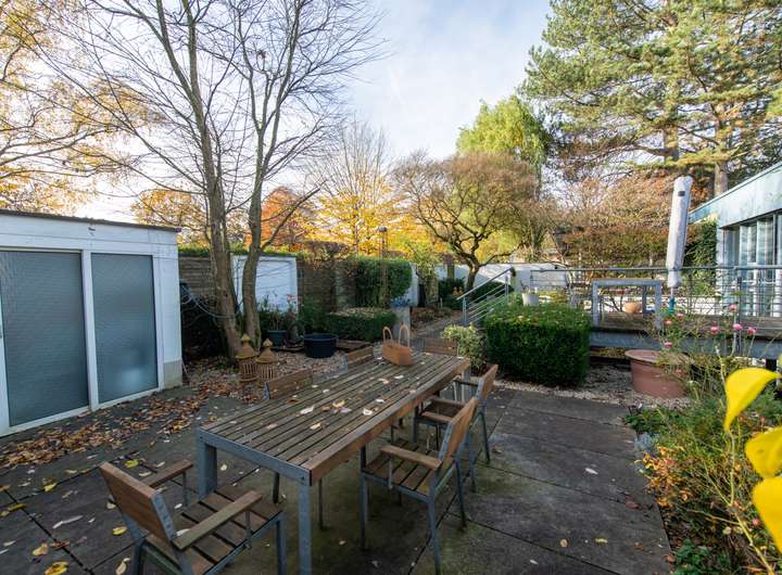Das Grundstück hat eine Größe von 533m² und ist nach Süden ausgerichtet. Besonders reizvoll sind hier die verschiedenen Gartenebenen, die einladenden Sitzbereiche - teilweise überdacht - und der kleine Teich, die zusammen eine harmonische und angenehme Atmosphäre schaffen.