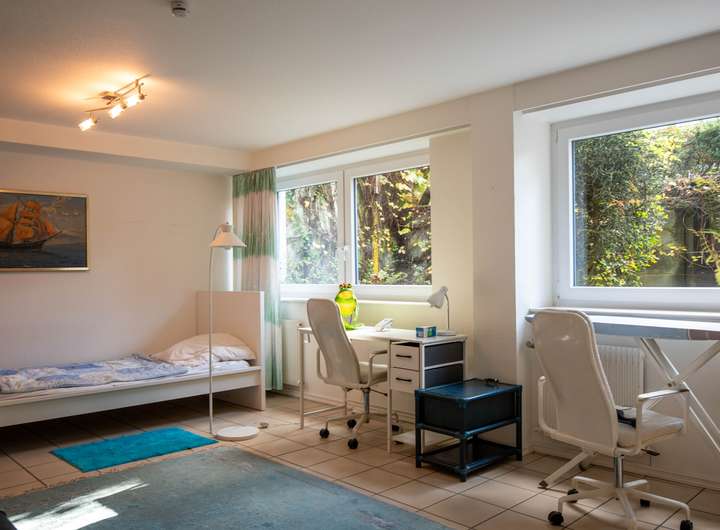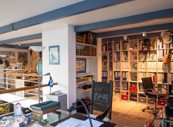 Im Untergeschoss befindet sich der Mittelpunkt des Hauses, der ca. 58m² große Wohnbereich. Die durchdachte Architektur gliedert den Raum in unterschiedliche Bereiche mit Kaminecke, gemütlichem Sitzbereich und z. B. einem Arbeits- / Leseplatz. Ergänzt wird die untere Ebene durch ein rd. 24m² (Nutzfl.) großes Zimmer mit viel Tageslicht – ideal z. B. als Gästezimmer oder für den „erwachsenen Sprösslinge“, sowie durch ein Gäste-WC mit Badewanne und einen Hauswirtschaftsraum. Ein Vorrats-, Heizungs- und Öltankkeller stehen als klassische Kellerräume zur Verfügung.