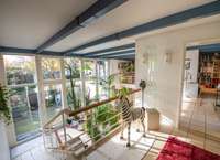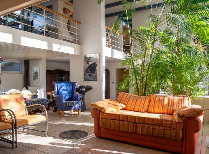 Mit der Hausbreite von rund 20m und ca. 172m² Wohnfläche (WoFIV) im Erdgeschoss und auf der unteren Wohnebene steht Ihnen hier ein ansprechendes Raumangebot zur Verfügung. Ein Highlight dieses Hauses ist das Entree mit der offenen Lese-Empore, das den Blick auf den darunterliegenden Wohnraum freigibt. Die galerieartige Architektur schafft ein beeindruckendes Raumgefühl, verbindet Erd- und Untergeschoss auf harmonische Weise und verleiht dem Haus eine besondere Eleganz. Die großzügige bodentiefe Fensterfront über 2 Etagen sorgt für ein helles Ambiente und schöne Blickachsen in den im Jahre 2003 komplett neu angelegten Garten.