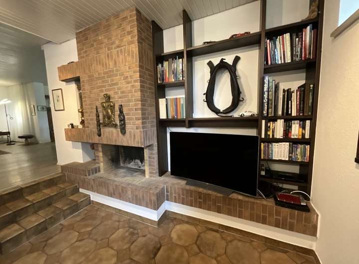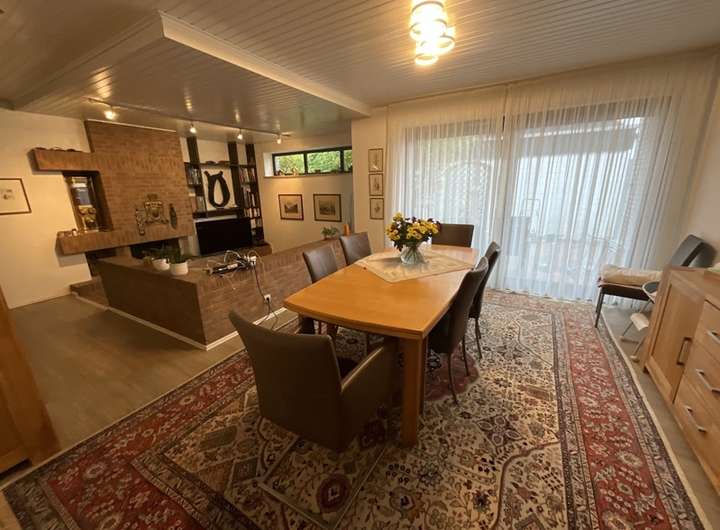 Die Wand zwischen Küche und Essbereich/ Kaminecke, könnte geöffnet werden, so dass Sie Ihre Küche zu einer Wohnküche verwandeln können.