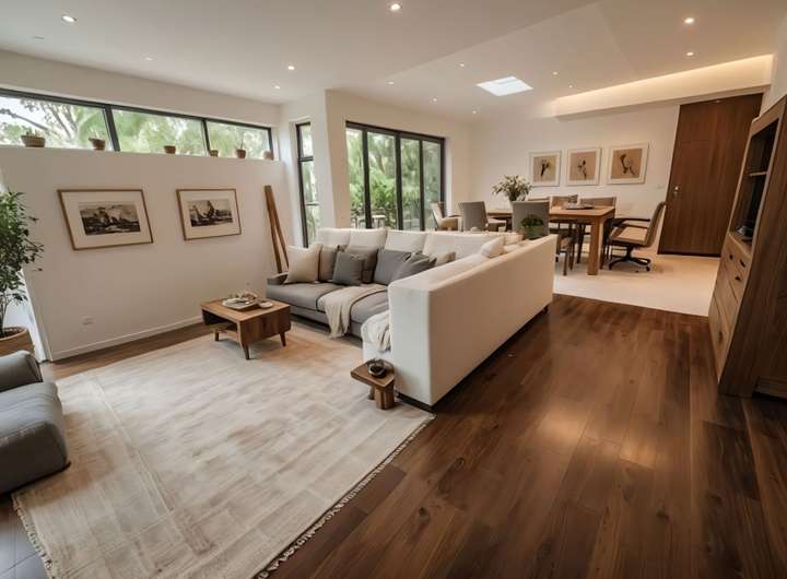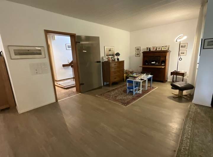 Der Eingangsbereich besticht durch einen Windfang und einen großzügigen Flur mit Garderobe. Auf dieser Ebene finden Sie ein Arbeits- oder Gästezimmer, ein Gäste-WC mit Duschmöglichkeit, sowie eine großzügige Küche mit Zugang zur Frühstücksterrasse. Das geräumige Esszimmer ist mit einer tiefergelegten Kaminecke ausgestattet, während der gemütliche Wohnraum direkten Zugang zur überdachten Südterrasse bietet.