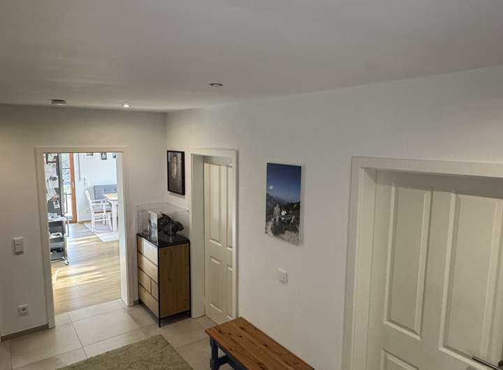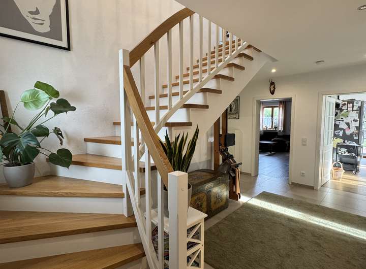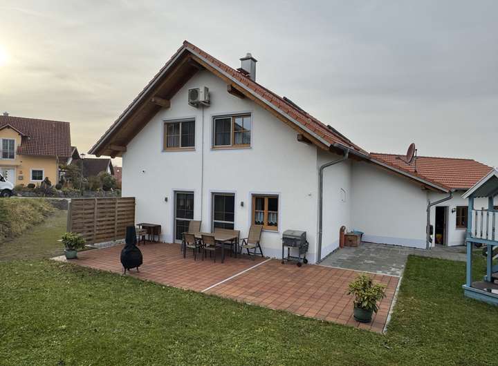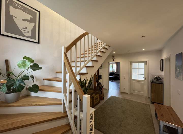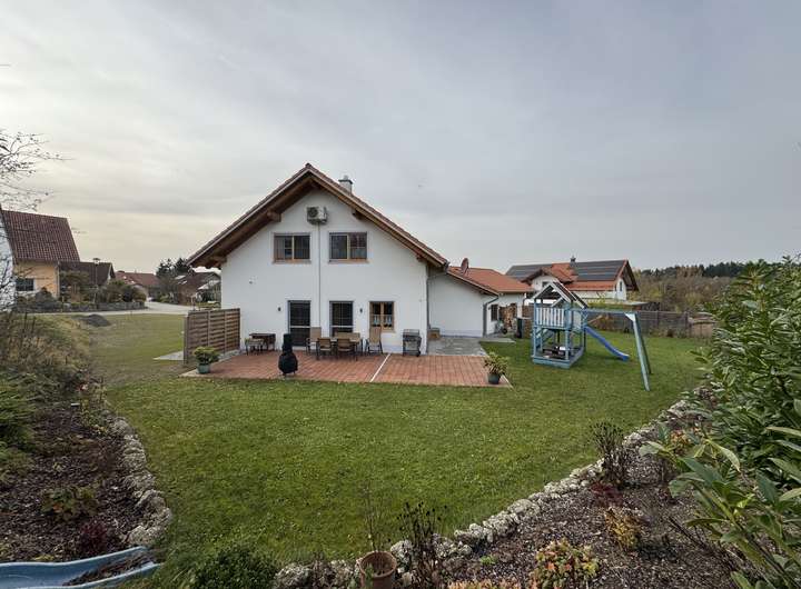 Das ansprechende Einfamilienhaus wurde 2019 in solider Bauweise auf einem wunderschönen großzügigem Baugrundstück erstellt. Die Räume wirken ansprechend und gemütlich, sie sind lichtdurchflutet und mit hochwertigen, zeitlosen Materialien ausgestattet. Die Küche ist ein großzügiger Raum mit viel Platz für den Essbereich.Das Wohnzimmer mit Kaminofen wirkt einladend. Ohne großen Aufwand kann es zur Küche hin geöffnet werden. Vom Wohnraum und der Küche aus betritt man eine große Terrasse mit Blick in den herrlichen, naturnahen Garten, der an Feld und Wiese grenzt. Im Erdgeschoss befinden sich zudem ein kleines Büro, ein Hauswirtschaftsraum und eine Speis sowie ein Gäste-WC , hier ist bereits eine Dusche vorbereitet, sie lässt sich ohne großen Aufwand installieren.