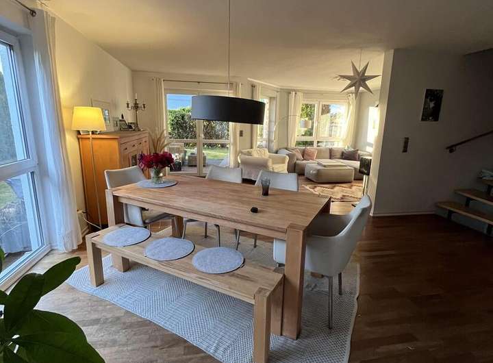 Vom Wohn-/Esszimmer gelangt man auf die großzügig gestaltete Terrasse und in den nicht einsehbaren Garten, welcher insbesondere für Kinder ein Traum ist.