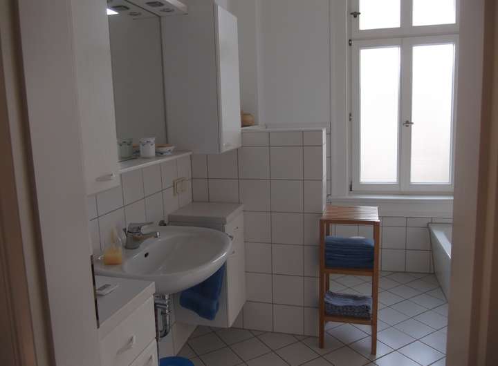 Eingerichtetes Tageslicht-Bad mit Dusche, Wanne, WC.