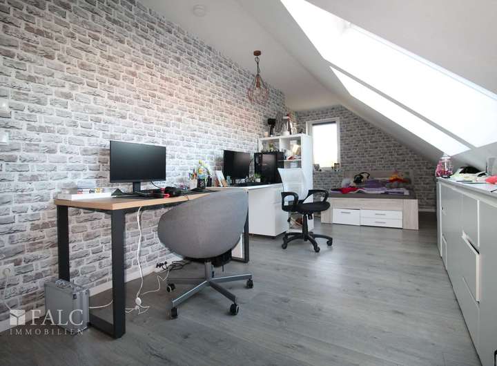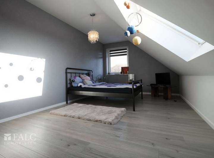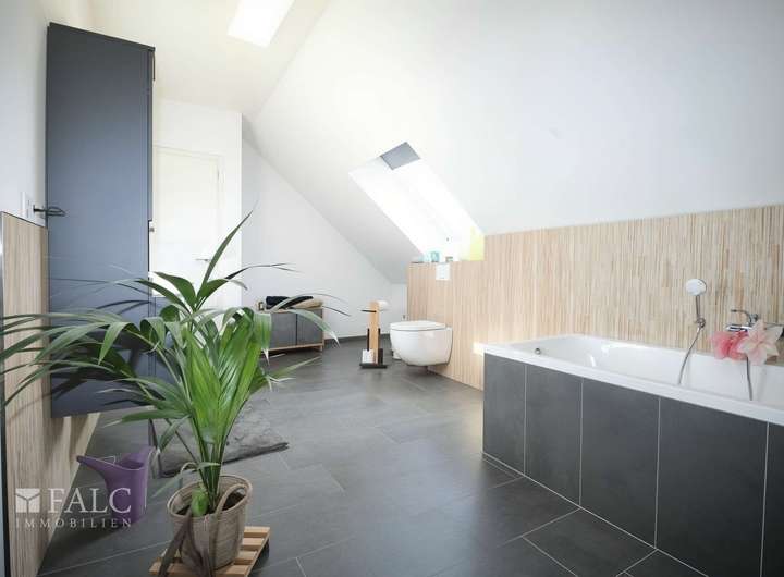 Über eine stilvolle Treppe gelangen Sie in das Dachgeschoss, wo drei einladende Schlafzimmer mit großen Dachfenstern auf Sie warten. Diese Fenster lassen viel Tageslicht herein und schaffen eine helle und freundliche Atmosphäre. Das großzügige Badezimmer auf dieser Etage ist mit einer Badewanne ausgestattet und bietet Ihnen die Möglichkeit, sich nach einem langen Tag zu entspannen.