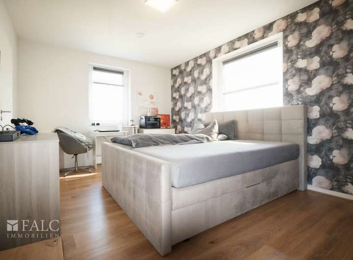 Im Erdgeschoss befindet sich zudem ein praktisches Gästezimmer mit eigener Ankleide, das vielfältige Nutzungsmöglichkeiten bietet. Ein kleines, aber feines Badezimmer sowie ein Hauswirtschaftsraum ergänzen das Raumangebot auf dieser Ebene und sorgen für zusätzlichen Komfort und Funktionalität.