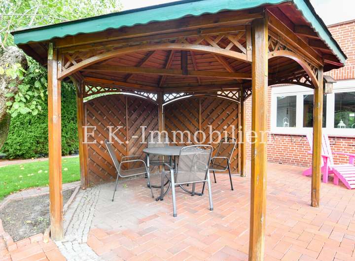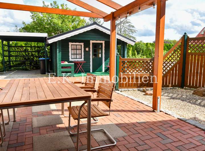 Der liebevoll angelegte Garten bietet zwei Terrassen: eine überdachte am Wohn-Essbereich und einen Pavillon im Grünen – perfekt zum Entspannen und Genießen.