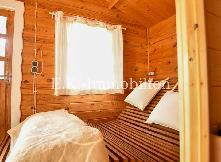 Gartenhaus mit Sauna (2022) und mit zusätzlicher Überdachung