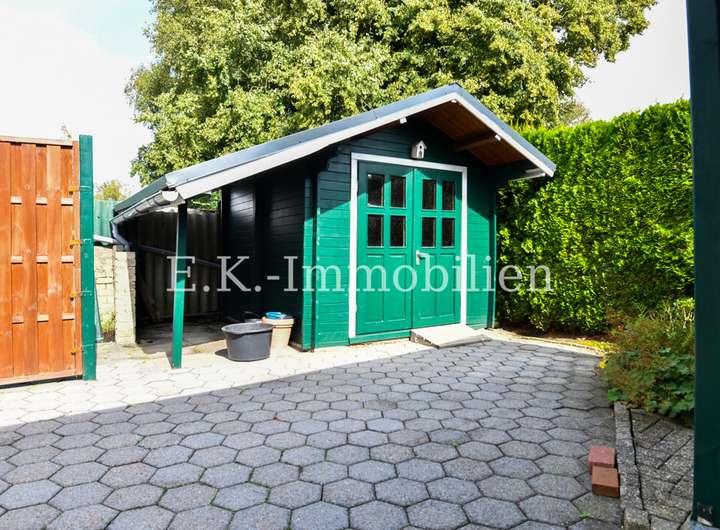 seitliche Überdachung als Unterstand für Geräte oder Holz,