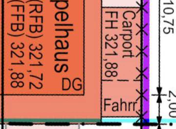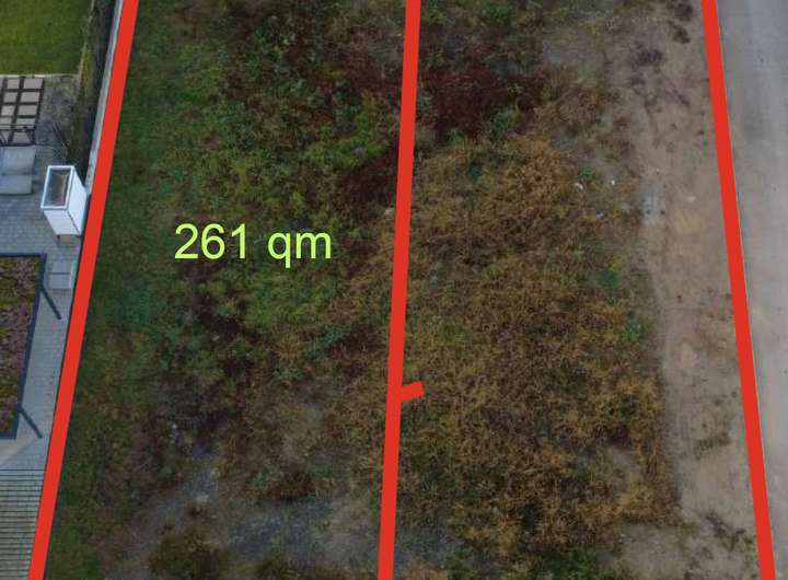 Die Bebauung richtet sich nach dem gültigen Bebauungsplan und ermöglicht die Errichtung einer Doppelhaushälfte mit zwei Vollgeschossen. Die Grundflächenzahl (GRZ) beträgt 0,4, die Gebäudehöhe kann flexibel zwischen 8,75 m und 9,5 m gewählt werden. Ein Flachdach mit einer Neigung von bis zu 3° ist vorgesehen. Das voll erschlossene Grundstück umfasst insgesamt ca. 261 m².