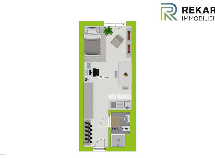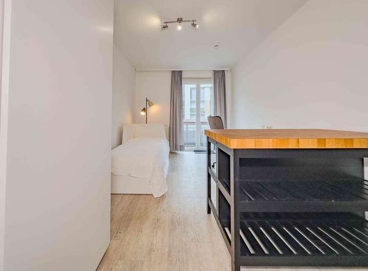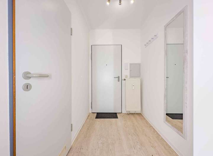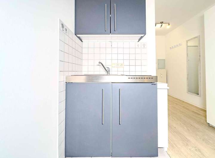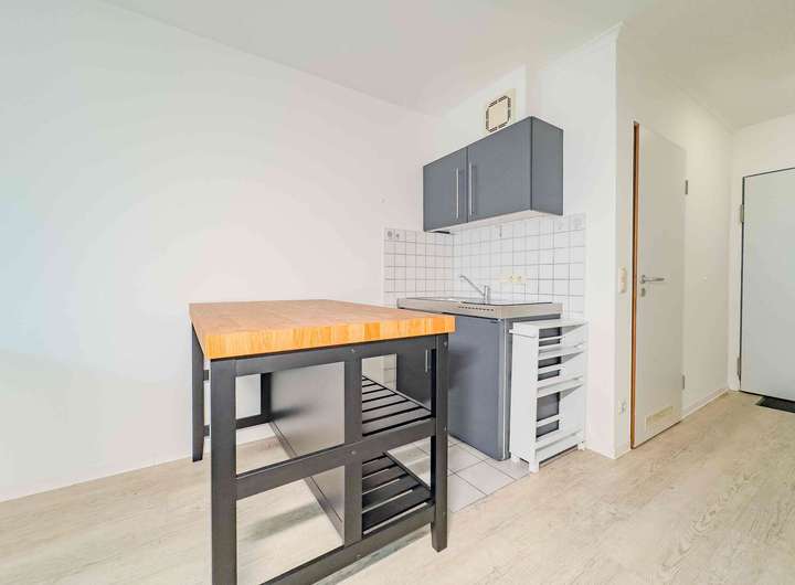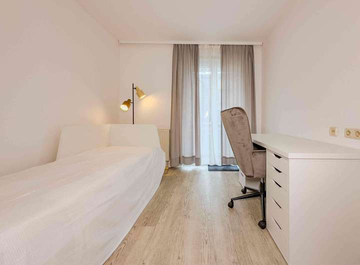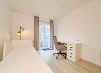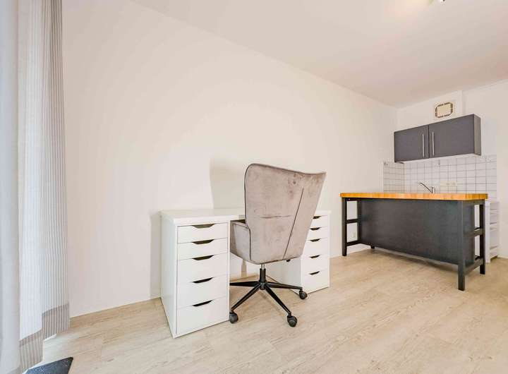 Die Einrichtung lässt keine Wünsche offen: Ein neuer Kleiderschrank, ein modernes Bett und ein praktischer Schreibtisch in zeitlosem Weiß machen das Wohnen hier besonders angenehm. Die Single-Küche ist perfekt ausgestattet – inklusive Kühl-/Gefrierkombi und Cerankochfeld – und bereit für alles, vom schnellen Frühstück bis zur Mitternachts-Pasta. Das Bad mit Dusche und WC bietet alles, was du brauchst, um dich frisch und startklar zu fühlen.