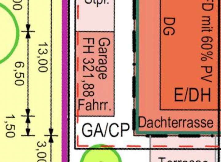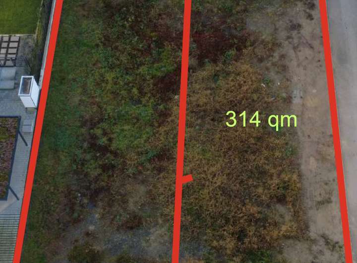 Die Bebauung richtet sich nach dem gültigen Bebauungsplan und ermöglicht die Errichtung einer Doppelhaushälfte mit zwei Vollgeschossen. Die Grundflächenzahl (GRZ) beträgt 0,4, die Gebäudehöhe kann flexibel zwischen 8,75 m und 9,5 m gewählt werden. Ein Flachdach mit einer Neigung von bis zu 3° ist vorgesehen. Das voll erschlossene Grundstück umfasst insgesamt ca. 314 m².