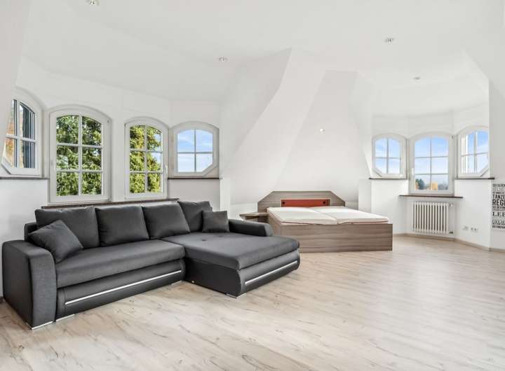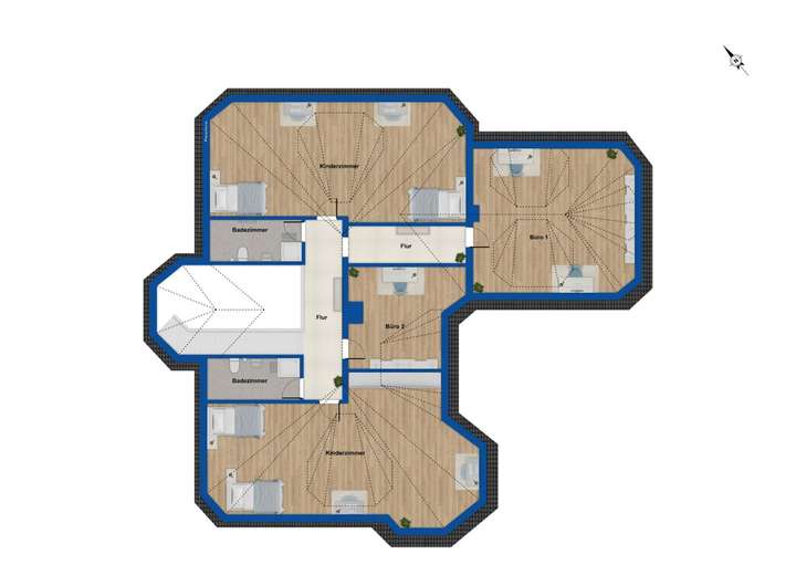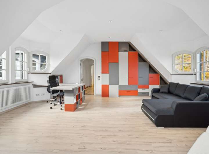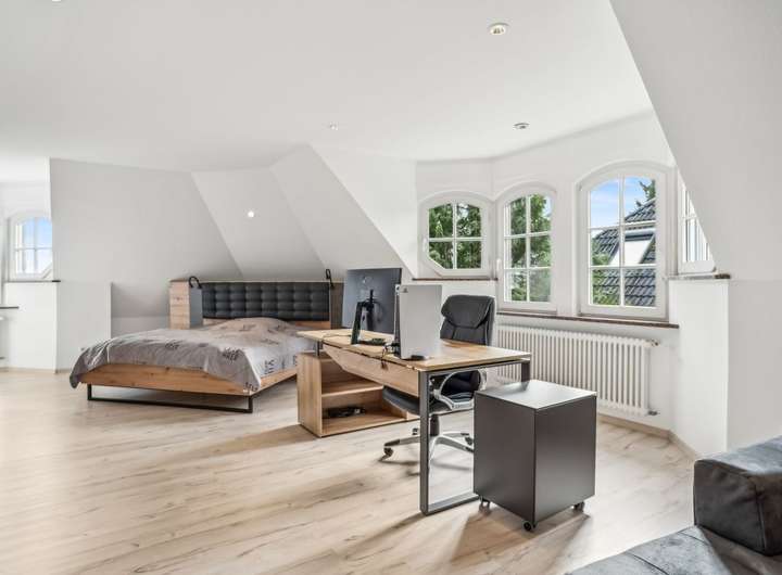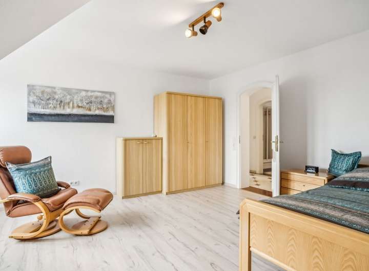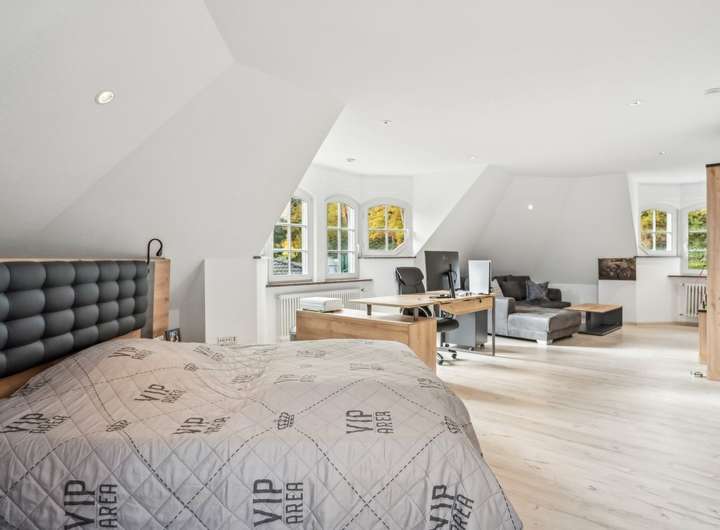 Im Obergeschoss eröffnet sich über die Galerie der Familienbereich – ideal für Kinder oder Gäste. Vier große Schlafzimmer (zwischen ca. 18 m² und 38 m²) bieten Raum für individuelle Entfaltung, während zwei kleinere Badezimmer den Alltag angenehm machen. Über eine elektrische Treppe gelangen Sie auf den Speicher – ein weiterer Pluspunkt für Ordnung und Stauraum.