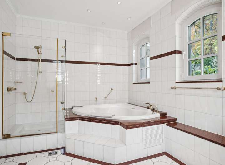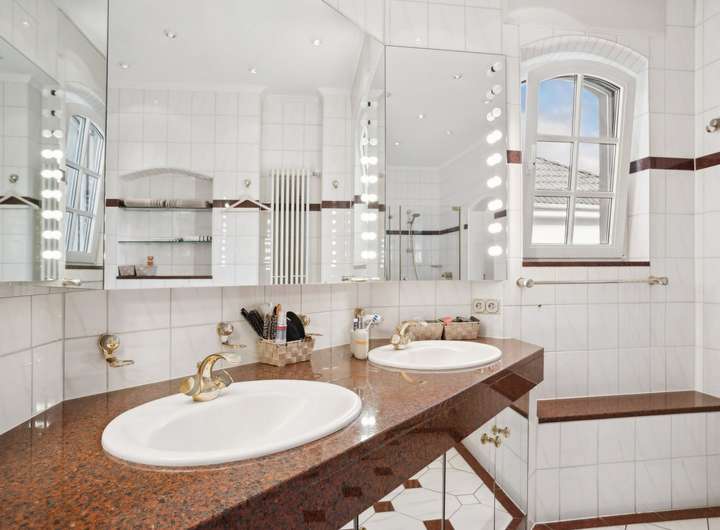 Bei der Ausstattung wurde auf höchste Qualität geachtet: Fußbodenheizung im gesamten Haus (beheizt über eine Ölheizung von ca. 2017), edle Fliesen im Erdgeschoss, hochwertiges Laminat in den Schlafräumen, massive Kassettentüren aus Holz und stilvolle Rundbogenfenster mit Isolierverglasung schaffen eine warme, luxuriöse Atmosphäre. Die Außenwände bestehen aus massivem Poroton und sind mit Dämmputz versehen, während die aufwendig gestaltete Dachlandschaft mit Naturschiefer gedeckt ist – ein Zeichen für Langlebigkeit und Stilbewusstsein.