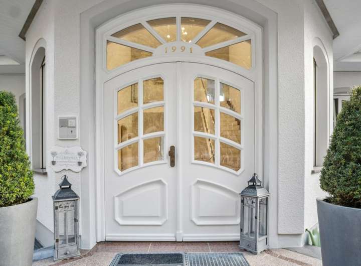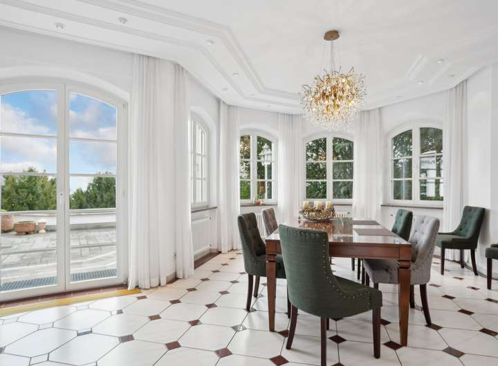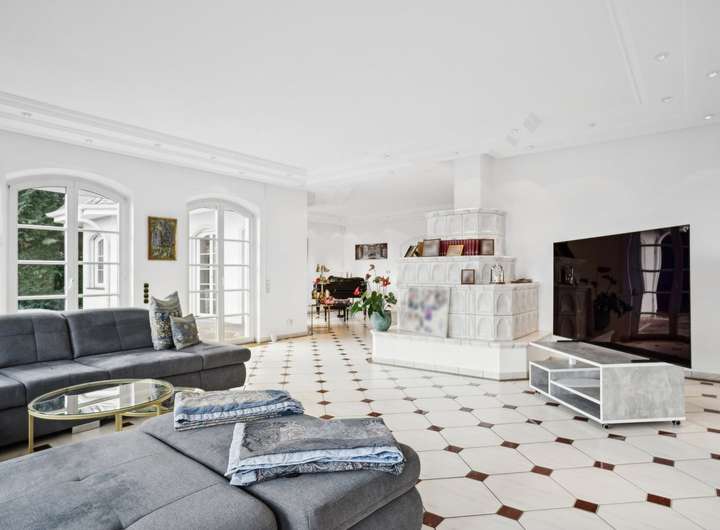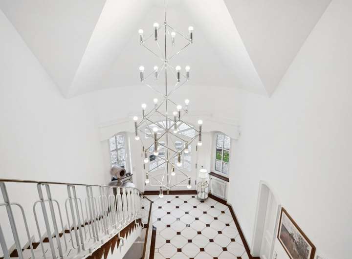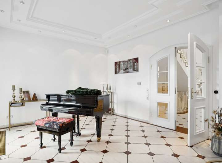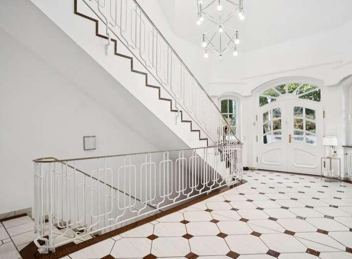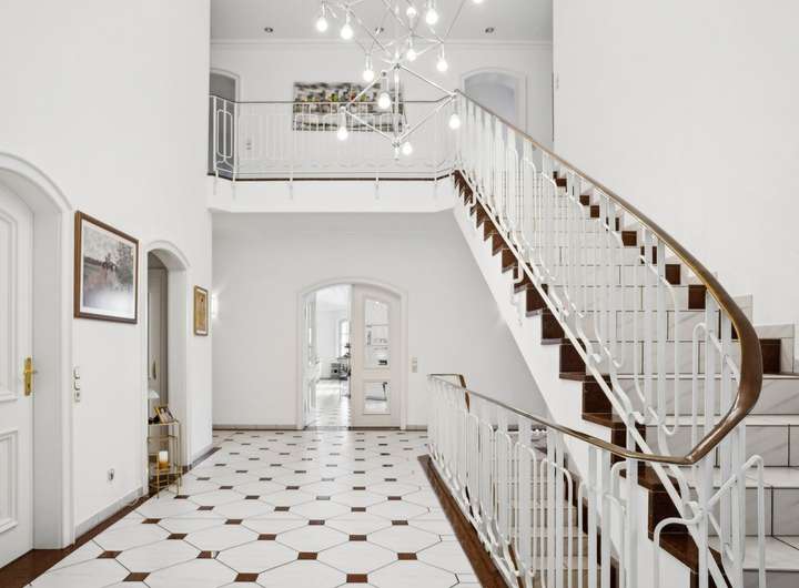 Der großzügige Hauseingang auf der Rückseite des Gebäudes führt Sie in eine eindrucksvolle Eingangshalle mit einer Galerie über beide Etagen. Der prachtvolle Kronleuchter, die hohen Decken und die gradlinigen Treppe verleihen diesem Raum eine Atmosphäre von zeitloser Eleganz. Hier beginnt Ihr ganz persönliches Wohngefühl.