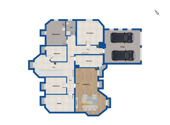 Der Keller hält sechs weitere Räume und ein Duschbad bereit – ideal für Fitness, Hobby oder Homeoffice. Dank direktem Zugang aus der Doppelgarage im Haus gelangen Sie auch bei Regen trockenen Fußes in Ihr Zuhause. Mehrere Außenstellplätze bieten zusätzlichen Komfort für Familie und Gäste.