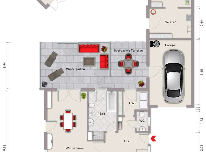 EG: Wohnzimmer, Wintergarten (beheizt), Küche, Bad, Gäste-WC, HWR, Flur; Hobbyraum, 2 Geräteräume, Garage