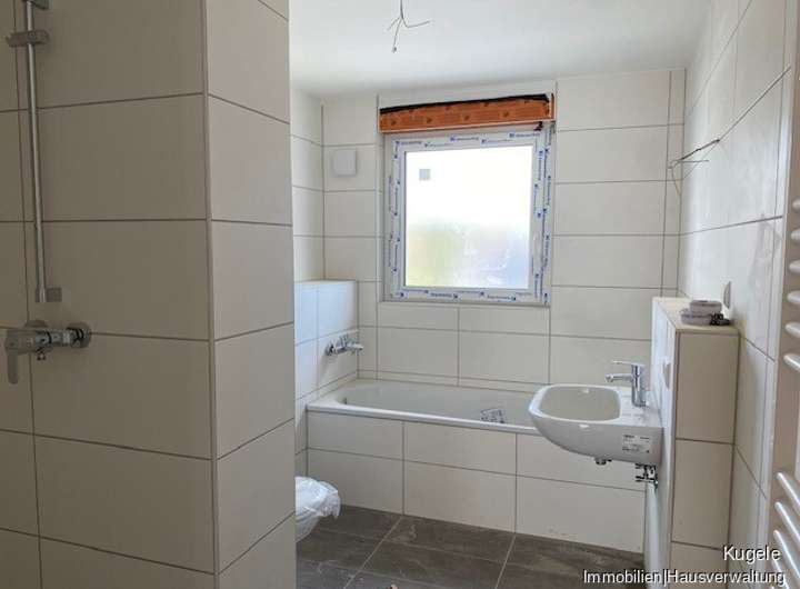 -Tageslichtbad mit Waschtisch, Wanne, Dusche, WC, sep. Gäste-WC, wandhängend, Einhandarmaturen, hochwertige/Standard Gegenstände, Farbe: weiß, raumhoch gefliest mit hellen, großformatigen Fliesen