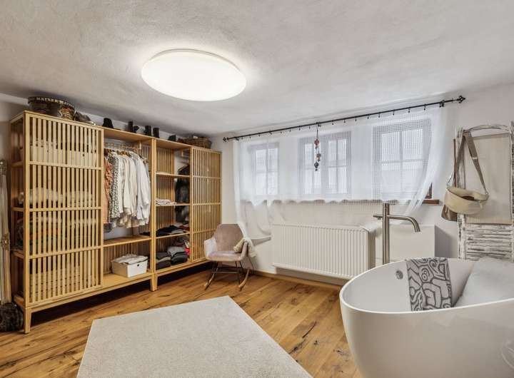 Die zwei Badezimmer im ersten Obergeschoss bieten sowohl eine bodengleiche Dusche als auch eine freistehende Badewanne für das besonderes Wellness-Erlebnis. Das Dachgeschoss ist für den weiteren Ausbau vorbereitet.