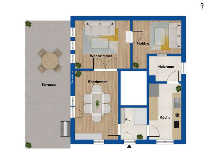 Die Erdgeschosszone ist großzügig zweigeschossig angelegt, wodurch eine besondere Raumwirkung entsteht. Eine große Terrasse lädt zum Sitzen im Freien ein und erweitert den Wohnbereich nach außen. Im Erdgeschoss ergänzt eine modern ausgestattete Einbauküche das Angebot.