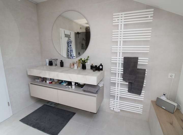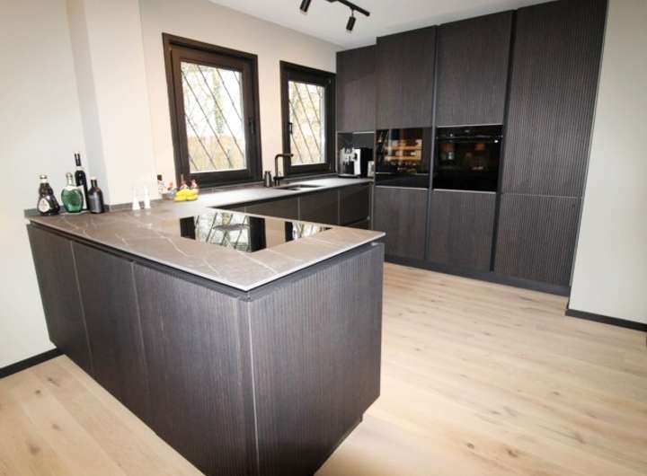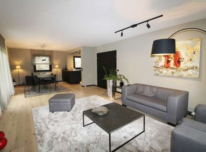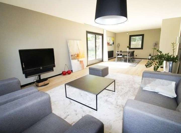 Man betritt das Haus über ein geräumiges Entree. Im Erdgeschoss dominiert der großzügige, lichtdurchflutete Wohn-/Essbereich mit Zugang zur Terrasse. Die angrenzende Küche ist mit einer hochwertigen Einbauküche ausgestattet. Ein Arbeitszimmer und ein Gäste-WC mit vorgelagerter Garderobe runden das Raumprogramm auf dieser Ebene ab.