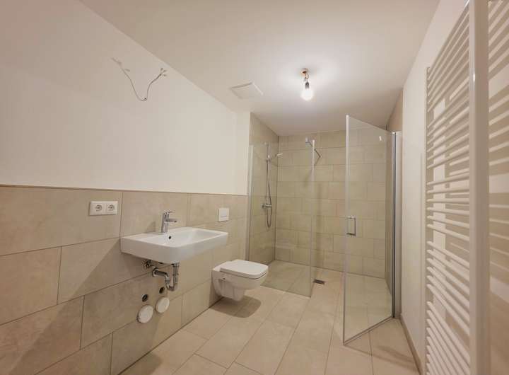 Das Schlafzimmer ist geräumig geschnitten und bietet ausreichend Platz für individuelle Einrichtungsideen. Das moderne Badezimmer ist mit großformatigen Feinsteinzeugfliesen, einer ebenerdigen Dusche sowie stilvollen Armaturen ausgestattet. Ein Abstellraum innerhalb der Wohnung sorgt zusätzlich für praktischen Stauraum.