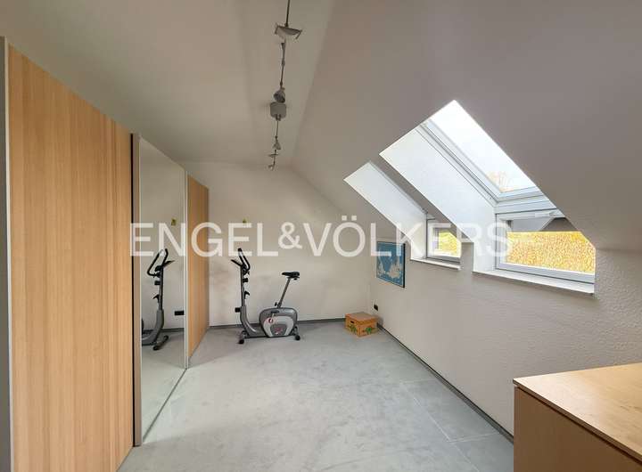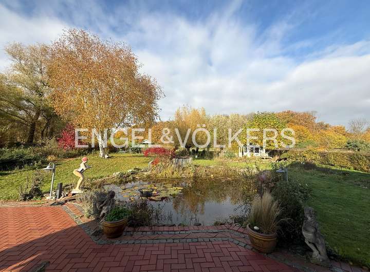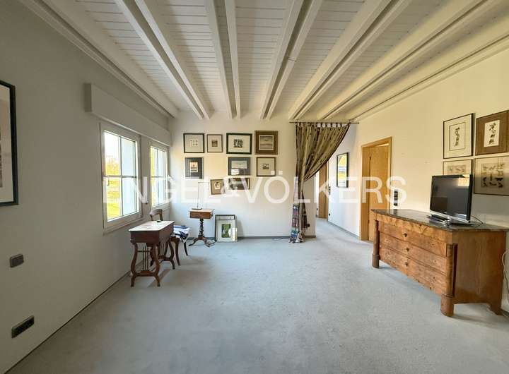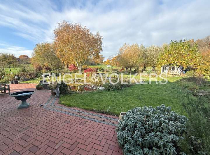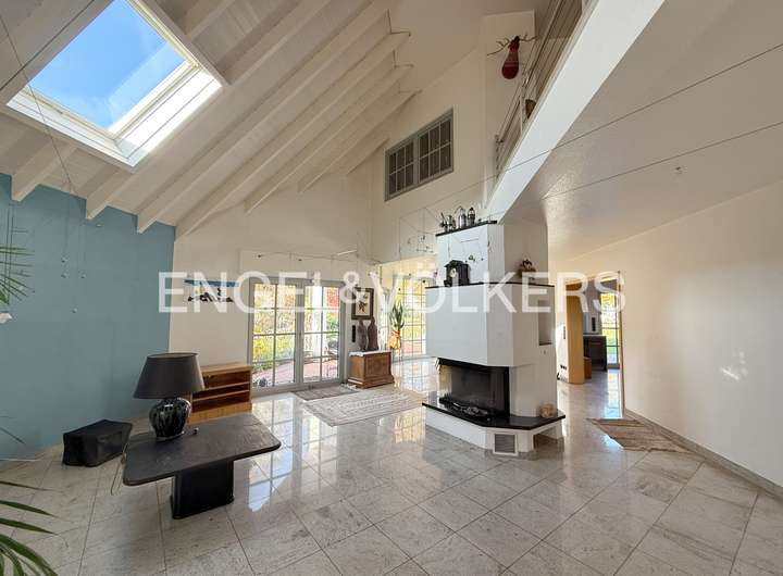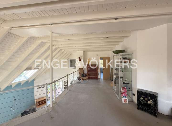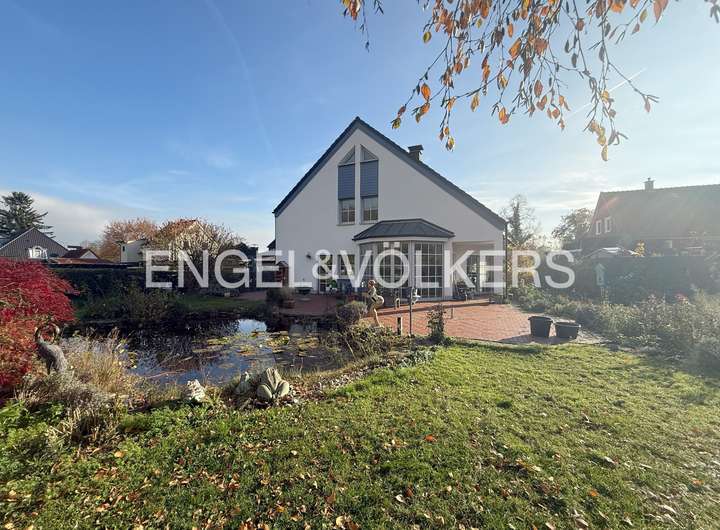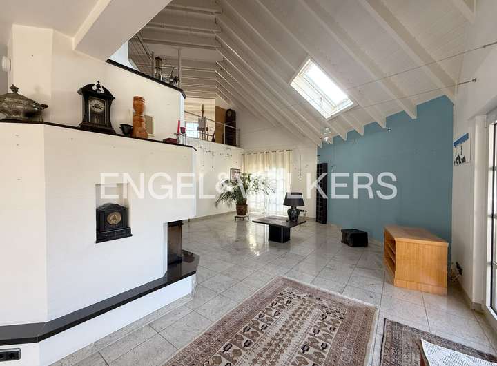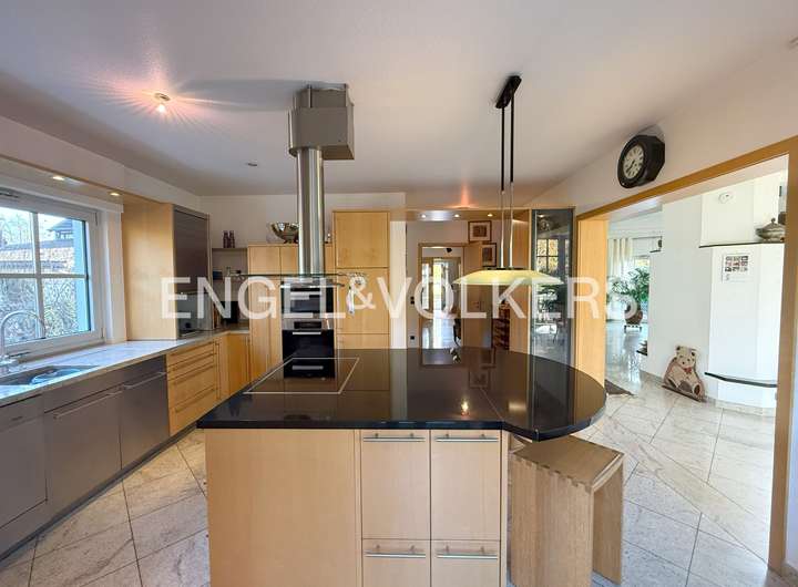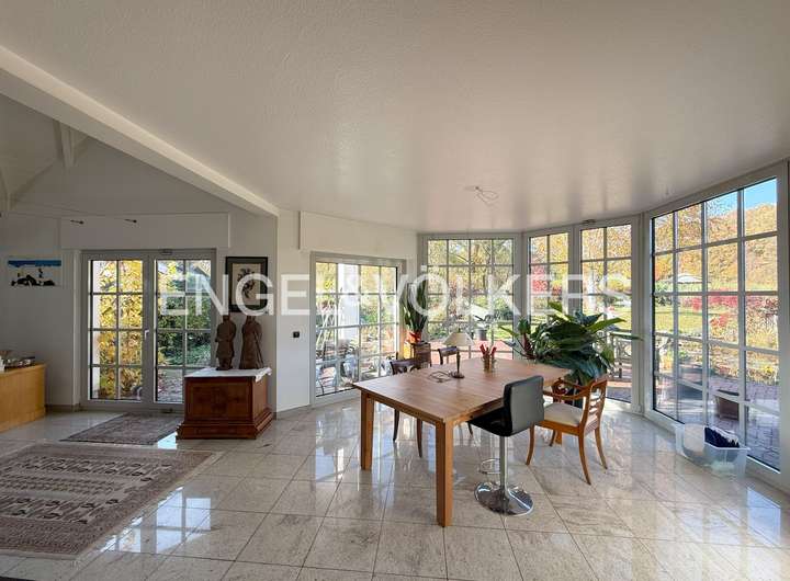 Willkommen in diesem architektonisch reizvollen Einfamilienhaus in Flierich, das auf rund 250 m² Wohnfläche einen durchdachten Grundriss mit idyllischer Lage vereint. Bereits im Entrée lenken bodentiefe Fenster den Blick in den sonnendurchfluteten Wohn- und Essbereich, wo ein eleganter Erker gesellige Mahlzeiten inszeniert und der Kamin an kühlen Tagen behagliche Wärme spendet. Direkt anschließend begeistert die großzügige, hochwertige Bulthaup-Küche. Im Erdgeschoss erwarten Sie außerdem ein stilvolles Schlafzimmer mit eigener Terrasse sowie ein modernes Bad mit großer, bodentiefer Dusche. Eine offene Granittreppe führt hinauf auf die weiträumige Galerie, von der Sie in den Wohnbereich blicken und die vielfältige Abstell- und Gestaltungsmöglichkeiten bietet; hier schließt sich auch ein helles Arbeitszimmer an. Die Elternsuite überzeugt mit einem ruhigen Schlafzimmer, separatem Ankleideraum und einem großzügigen Bad, das neben der geräumigen Dusche eine Wanne, ein Waschbecken und einen rund zwei Meter breiten Spiegel bereithält. Im Außenbereich laden eine große Terrasse und der liebevoll angelegte Garten mit Teich, mehreren idyllischen Sitzplätzen sowie freiem Blick über Wiese und Wald zum Verweilen ein. Für die Bewässerung sorgt ein eigener Brunnen. Zwei Garagen sowie ein weitläufiger Hof mit zusätzlichen Stellplätzen bieten reichlich Raum für Ihre Fahrzeuge. Die 1994 errichtete Liegenschaft verbindet anspruchsvolle Architektur und unmittelbare Naturnähe auf ideale Weise. Beheizt wird das gesamte Haus über eine Fußbodenheizung, gespeist von einer modernen Gasheizung aus dem Jahr 2022. Entdecken Sie Ihr neues Zuhause und vereinbaren Sie noch heute Ihren persönlichen Besichtigungstermin!