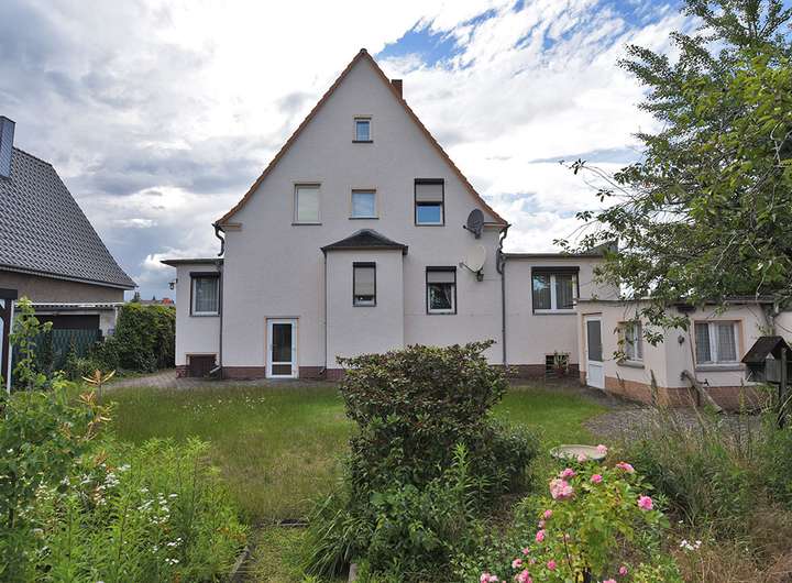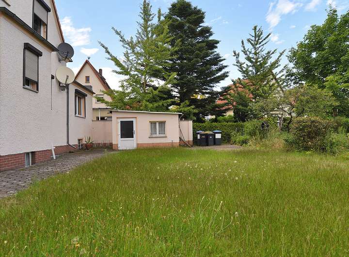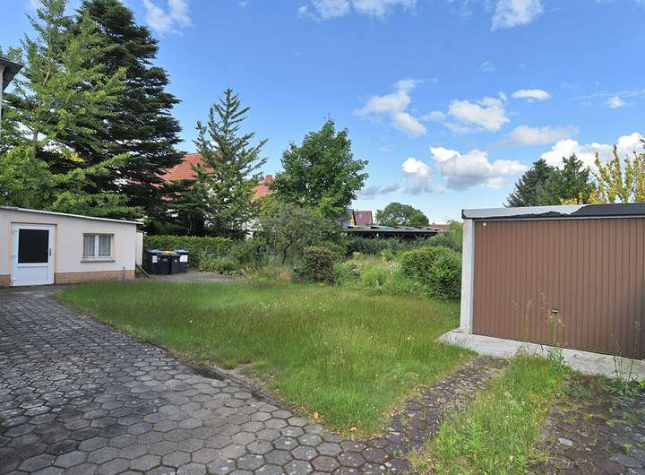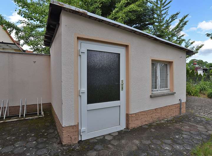 Auf dem großzügigen Gartengrundstück befinden sich eine Garage sowie ein massives Gerätehaus.