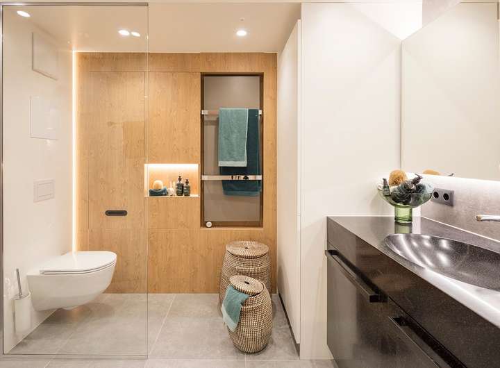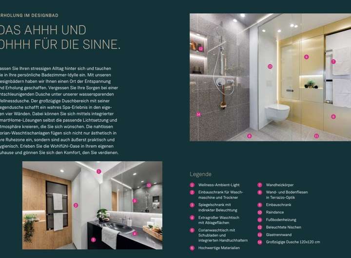 - Hochwertige Designbäder mit bodenebener Dusche (1.20m x 1.20m), Raindance, beleuchteten