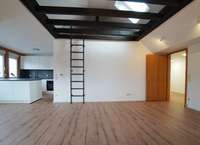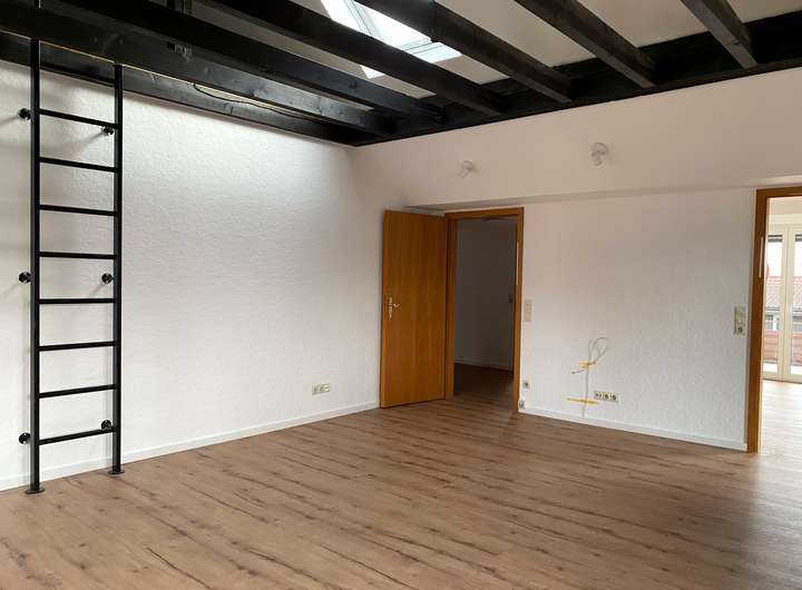 Mittelpunkt der Wohnung ist der großzügige, lichtdurchflutete Wohn- und Essbereich mit sichtbaren Holzbalken, die dem Raum ein warmes, einladendes Ambiente verleihen. Von hier aus führt eine offene Treppe in einen zusätzlichen Atelier-/Galeriebereich, der sich ideal als Stauraum oder für individuelle Nutzungsmöglichkeiten eignet.