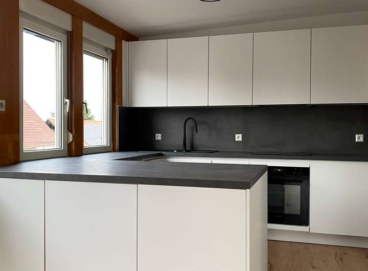 Der offen gestaltete Küchenbereich fügt sich harmonisch in den Wohnraum ein und ist mit einer komplett neuen Einbauküche samt Elektrogeräten ausgestattet. Ein praktischer, angrenzender Abstell- bzw. Haushaltsraum bietet zusätzlichen Stauraum.