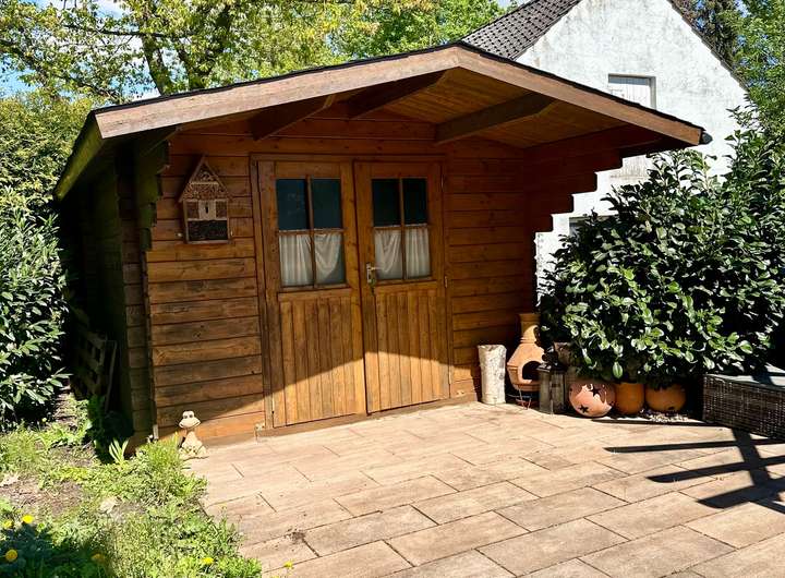 Pflegeleicht angelegter Garten mit 2 Terrassen und Gartenhaus.Ein befestigter Hof befindet sich am rückwärtigen Teil der Doppelgarage.
