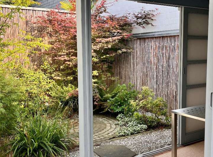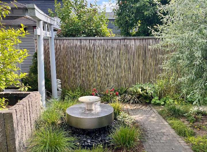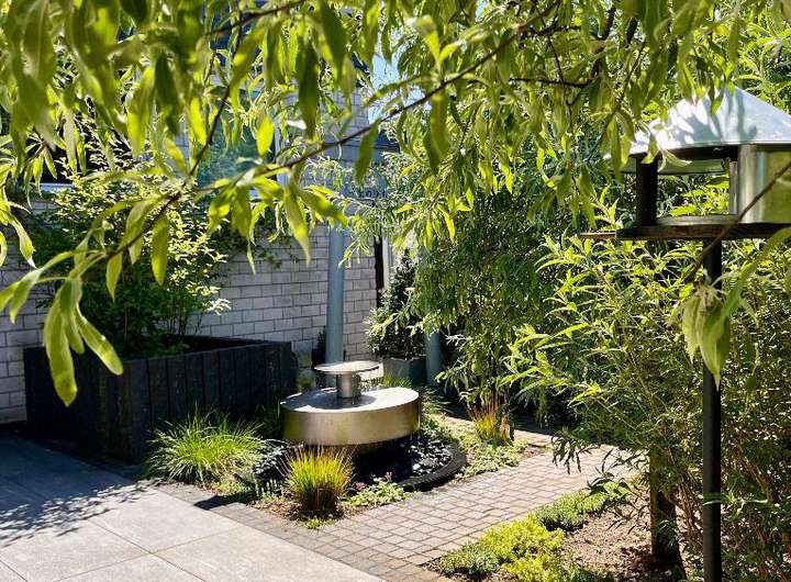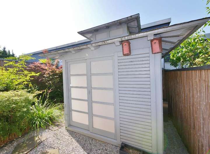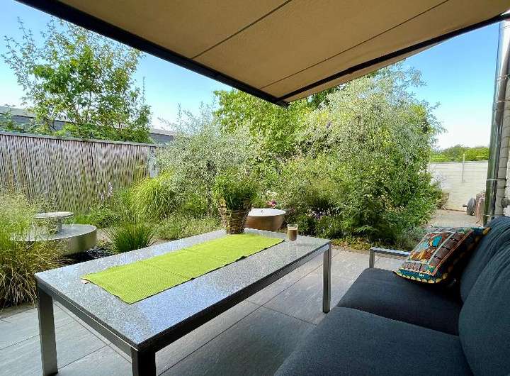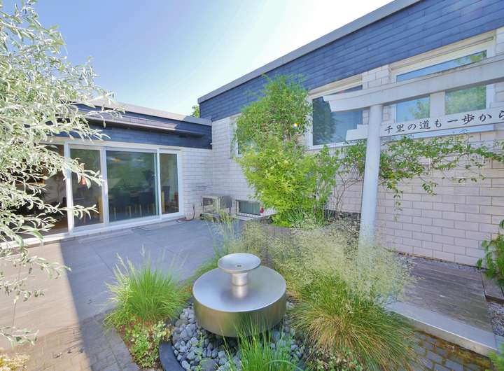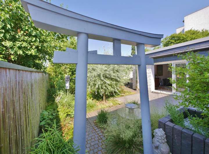 Im schönen Innenhof punktet die große Terrasse, das im japanischen Stil gehaltene Gartenhaus und das hochwertige Edelstahlwasserspiel. Die vollelektrische Markise spendet nicht nur Schatten auf der Süd-Terrasse, sondern kann diese auch dimmbar beleuchten.
