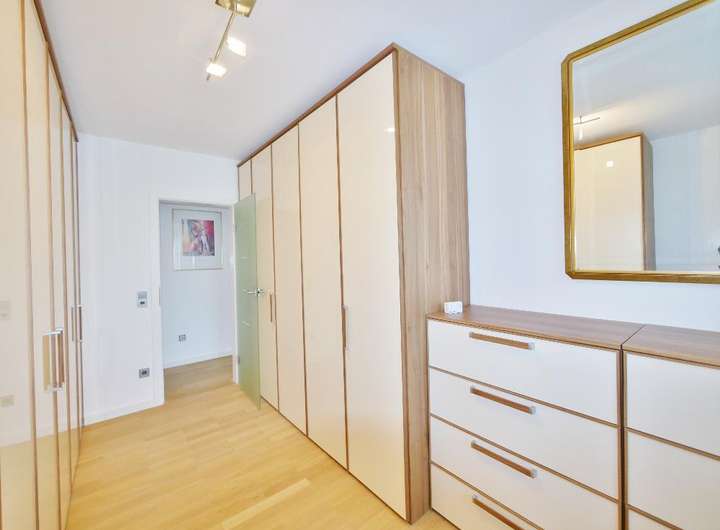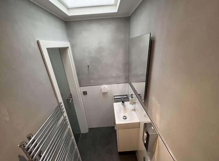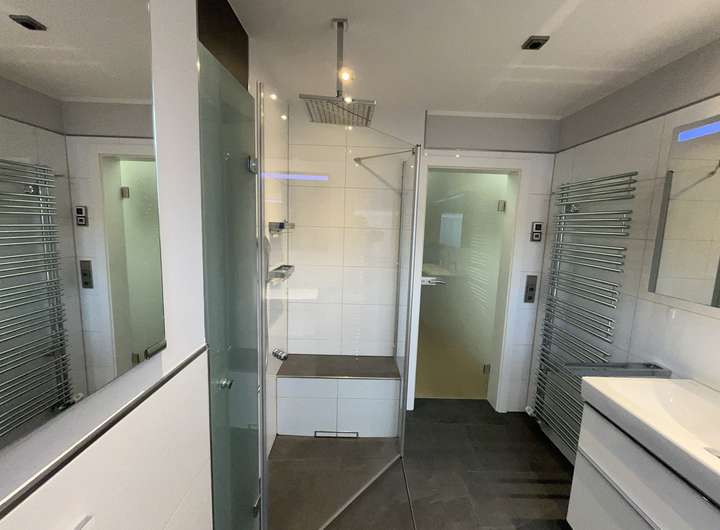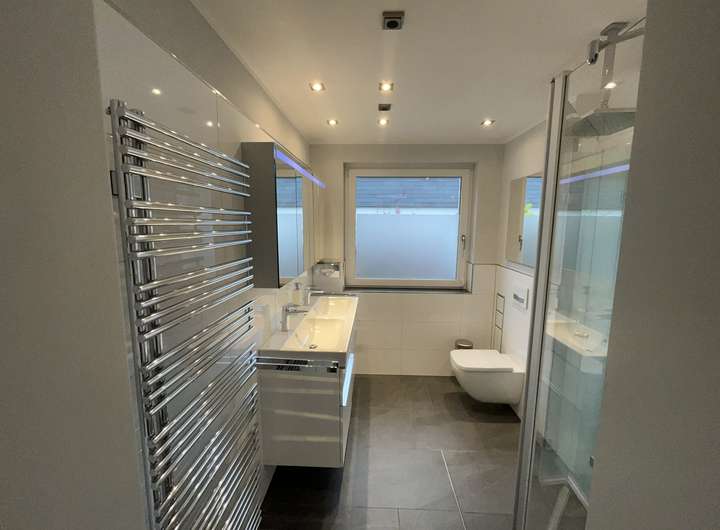 Ein großes Schlafzimmer, ein modernes und geschmackvolles Badezimmer mit Dusche sowie ein weiterer, flexible als Arbeits- Ankleide- oder Kinderzimmer nutzbarer Raum komplettieren zusammen mit einem eleganten Gäste WC im großzügigen Entrée die Ausstattung der Wohnebene.