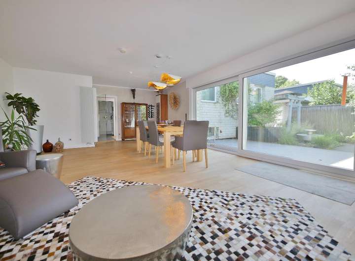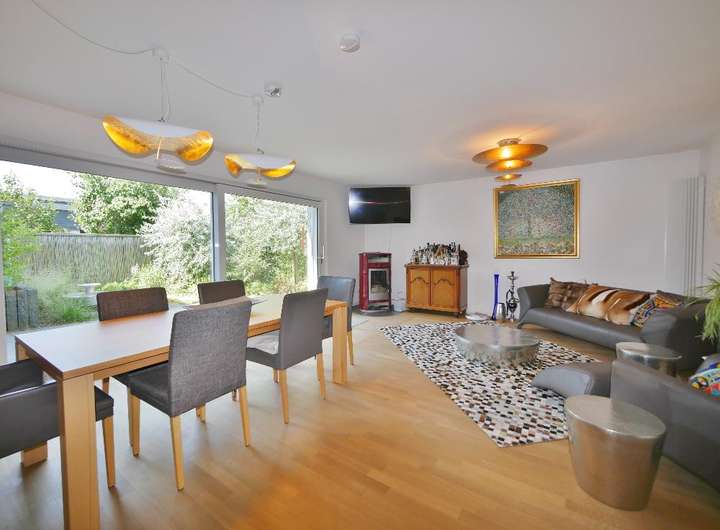Der große und helle Wohn-Essbereich mit wunderbarem Blick auf die Terrasse und in den nahezu uneinsehbaren Garten ist der Mittelpunkt des Hauses.