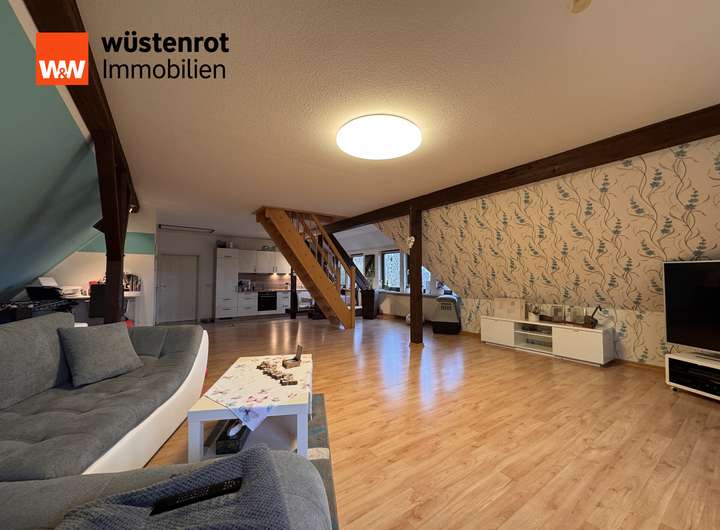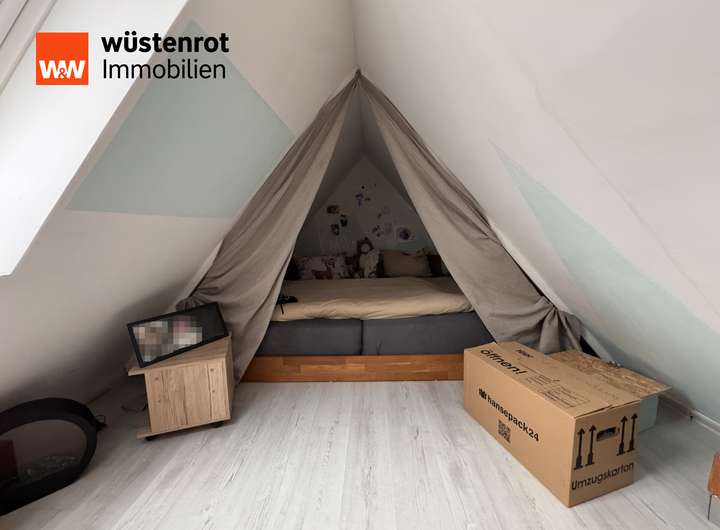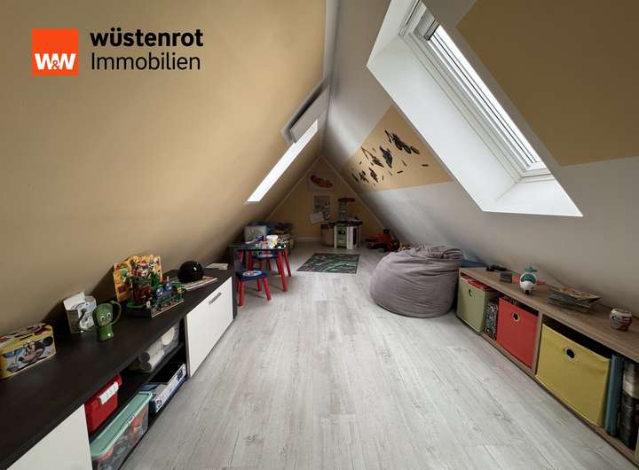 Im Obergeschoss öffnet sich das Herzstück des Hauses: ein großzügiger Wohn- und Küchenbereich auf rund 56 m², der durch seine offene Gestaltung, die helle Atmosphäre und den Blick ins Grüne begeistert. Hier lässt sich das Familienleben in vollen Zügen genießen – gemeinsames Kochen, Spielen, Entspannen oder gemütliche Abende am Esstisch. Ein angrenzendes Schlafzimmer und ein weiteres Zimmer bieten zusätzlichen Platz für Rückzug, Gäste oder Homeoffice.