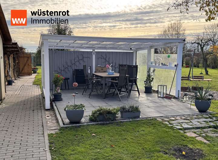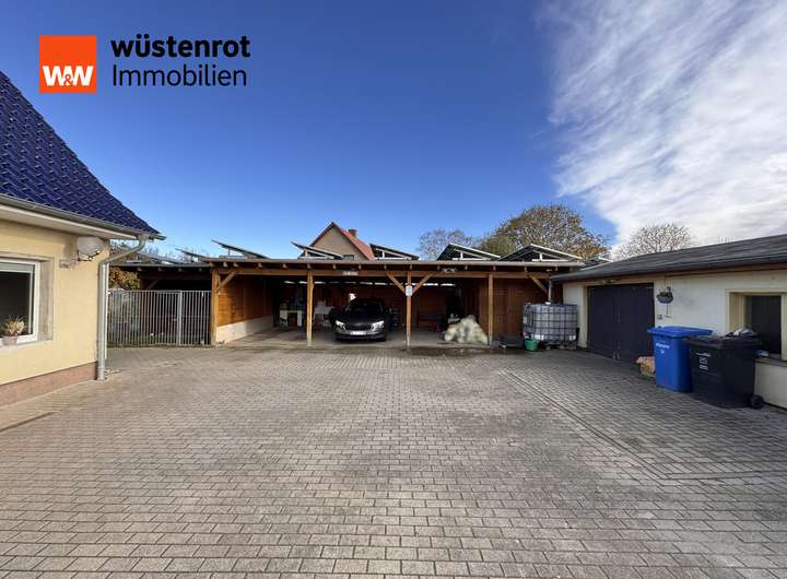 Mehrere Carports und eine Garage bieten reichlich Platz für PKW, Motorräder oder Wohnwagen. In den Nebengebäuden findet sich zusätzlicher Stauraum für Werkzeuge und Gartengeräte. Die moderne Heizungsanlage aus 2013 wird von einer Solarthermieanlage unterstützt, während die Photovoltaikanlage (9,6 kW, Baujahr 2012) auf den Carportdächern einen wertvollen Beitrag zur Energieeffizienz leistet – ökologisch und wirtschaftlich zugleich.