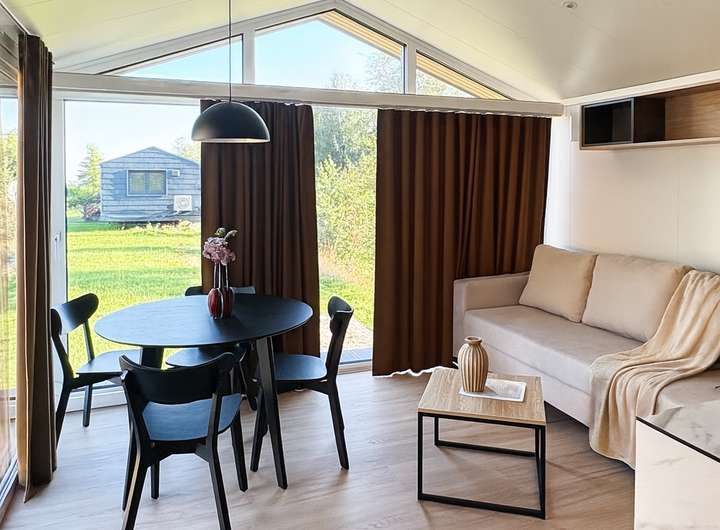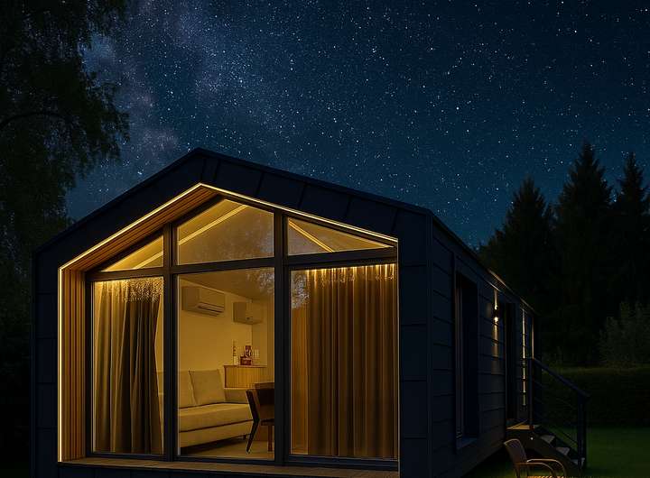 Dieses neuwertige Tiny House bietet mit 57,2 m2 Grundfläche und 45,7 m2 Wohnfläche außergewöhnlich viel Raum und Komfort. Die 4,30 m Außenbreite sowie die große Fensterfront im Wohnbereich schaffen ein helles, offenes Wohnambiente und eignen sich ideal für dauerhaftes Wohnen oder als attraktive Kurzzeitvermietung.