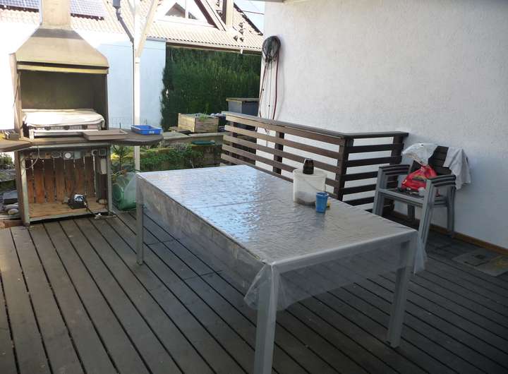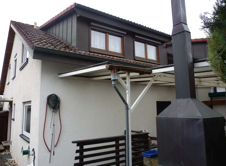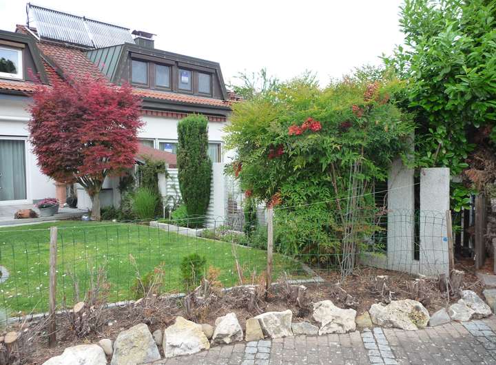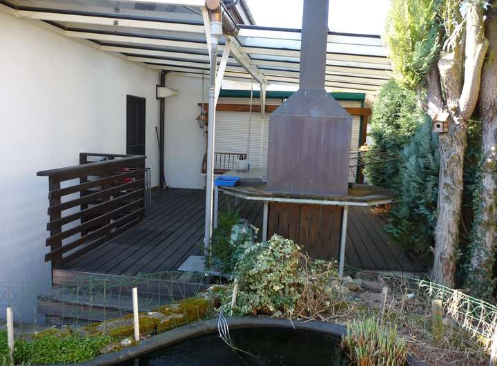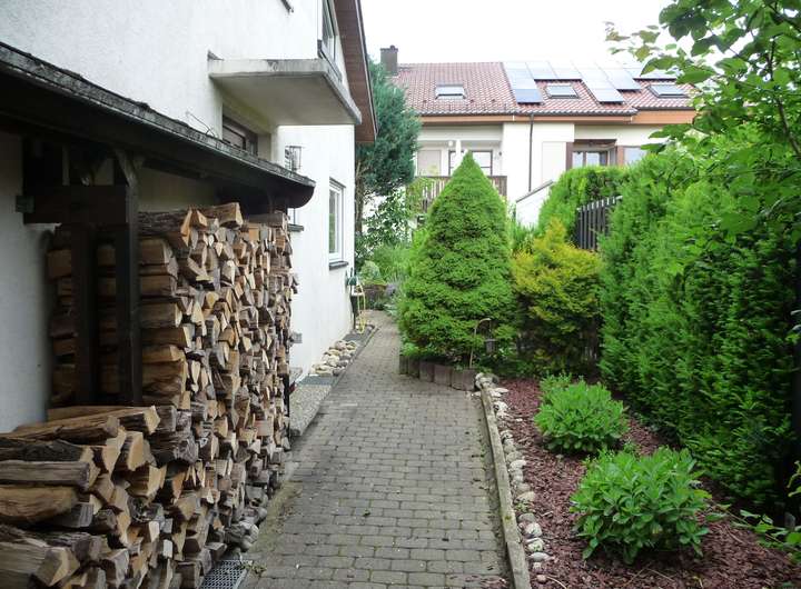 Die DHH verfügt über eine Garage, die mit einem regulären PKW schwer befahrbar ist, ein Doppel-Carport-Stellplatz und ein weiterer Stellplatz für Pkw, eine große Terrasse vor dem Gebäude in Südrichtung, Fischteich, überdachte große Terrasse mit Grillbereich und kleiner Gartenanteil.