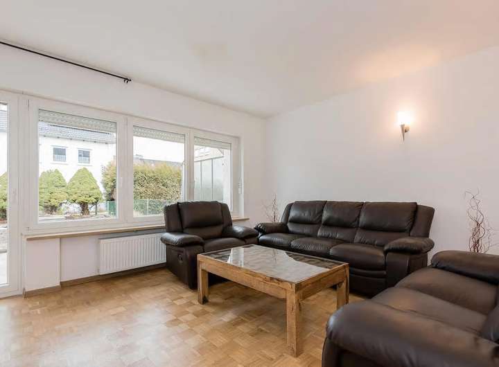 Großes Wohnzimmer mit Parkett und Zugang zur Terrasse auf der Sie sich vom stressigen Alltag erholen können. Im Wohnzimmer befinden sich elektrische Rollos.