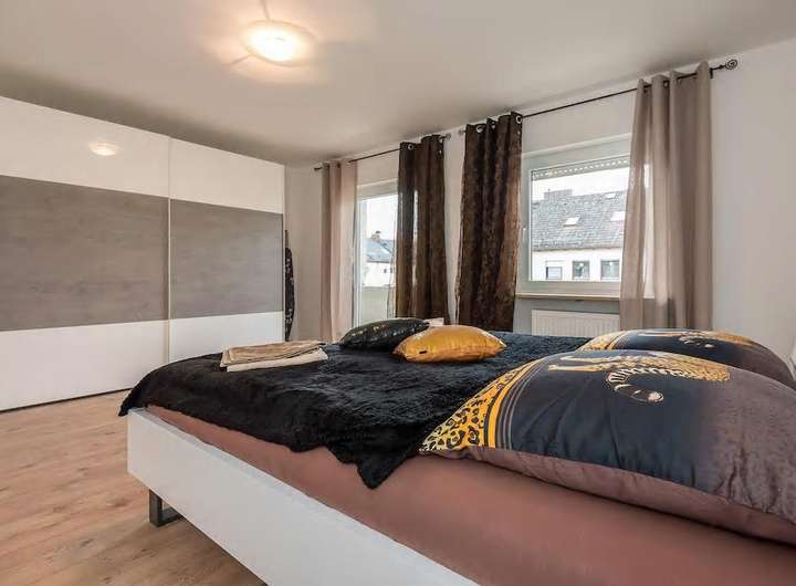 Großes Schlafzimmer mit Vinylboden und Zugang zum Balkon.